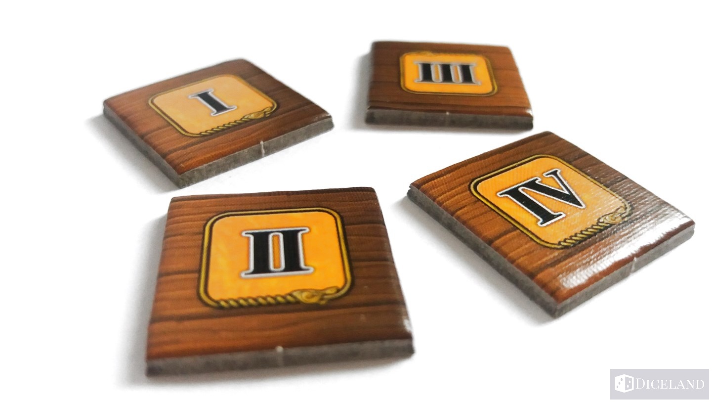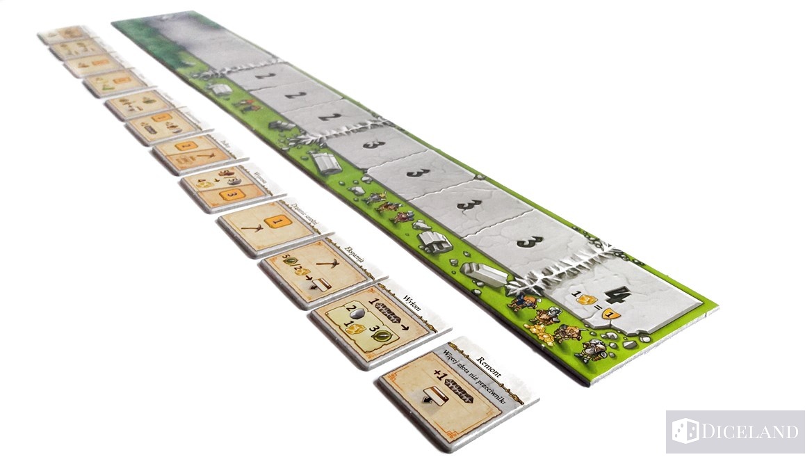 Jak już wcześniej wspomniałem, otrzymujemy kafelki, które umieścimy na specjalnie przygotowanej podłużnej planszy, która z jednej strony przeznaczona jest dla wariantu jednoosobowego, a z drugiej dla dwóch osób. Cyferki na niej oznaczają, na jakich polach umieścimy odpowiednie kafelki. Także jak się już pewnie sami domyślacie, będzie zachodziła tu pewna losowość, która istotnie wpłynie na regrywalność tej pozycji.