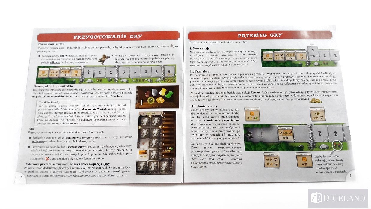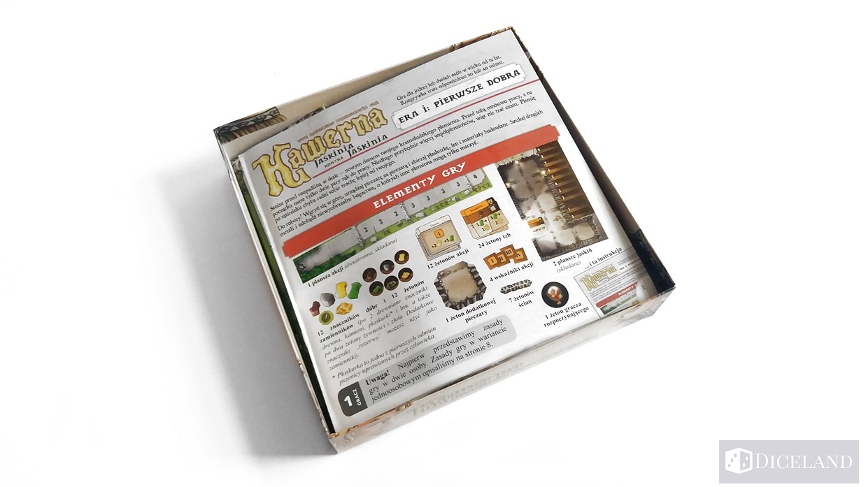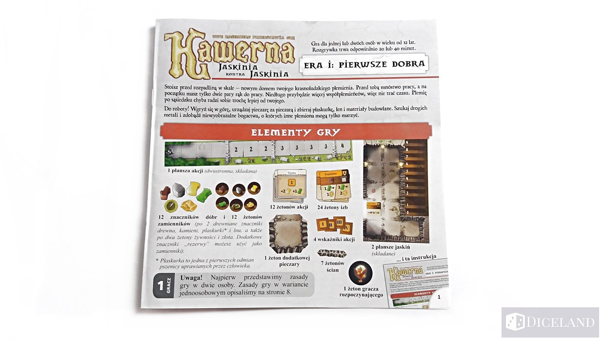 Już na samej górze widnieje bardzo ciekawa i zastanawiająca informacja. Chodzi o napis „Era I: Pierwsze Dobra”, czyżbyśmy się mięli spodziewać kolejnych odsłon mini-kawerny? Jest to bardzo możliwe i wydaje mi się, że poszczególne elementy będzie można za sobą łączyć. Pożyjemy, pogramy, a czas pokaże. Instrukcja została napisana poprawnie i tuż po jej lekturze nie miałem wątpliwości jak prawidłowo wykonywać akcje w swojej turze. Zawiera ona wiele ilustracji, a na jej końcu pojawiły się dodatkowe informacje o zmianach w przygotowaniu i rozgrywce dla pojedynczego gracza.