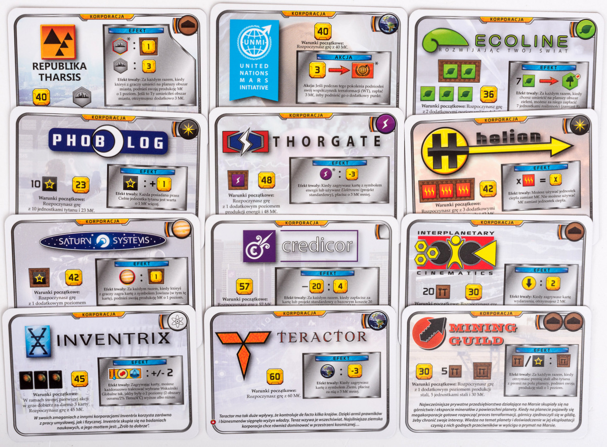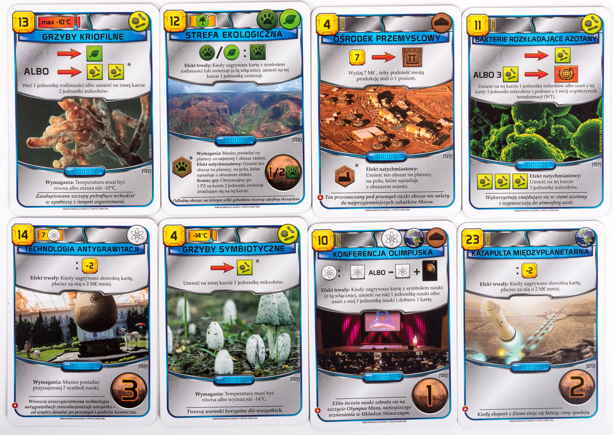 Najlepsza gra w którą grałem do tej pory, a zarazem najświeższa z omawianych, wydana w 2016 roku. Gra nieznanego autora Jacoba Fryxieliusa, który projektował tę grę razem ze swoją rodziną. Gra, która polega na tzw. Terraformacji czerwonej planety (przekształcania w planetę zdatną do życia). Gracz tutaj wciela się w jedną z kilku korporacji, których zadaniem jest właśnie przekształcenie Marsa w planetę zdatną do życia. Każda z tych korporacji cechuje się inną strategią, dlatego też wybierając daną korporację musimy poniekąd dostosować się do niej. Zadaniem wspólnym dla wszystkich graczy jest podniesienie poziomu tlenu do 14%, „wybudowania” 9 obszarów oceanów w odpowiednich miejscach na marsie, oraz zwiększenie średniej temperatury na równiku do 8 stopni. Gdy wszystkie cele uda nam się wykonać, gra się kończy, a gracz który najbardziej przyłożył się do terraformowania – pozostaje zwycięzcą. Podczas gry będziemy zagrywać całą masę kart (233 karty) zwykłych, a także korporacyjnych (które dołączone są do gry w ramach dodatku i jeszcze bardziej wydłużają i tak trwającą dość długą rozgrywkę). Właśnie, długość rozgrywki – na opakowaniu mamy napisane, że gra może trwać od 90 do 120 minut. Jednakże grając pełny wariant z kartami korporacyjnymi (które bardziej skupiają się na rozwoju korporacji niż samej terraformacji), a także z draftem – gra może trwać nawet do 360 minut. Tak, można w tę grę grać nawet do 6 godzin, ale czas ten upływa niezwykle przyjemnie.