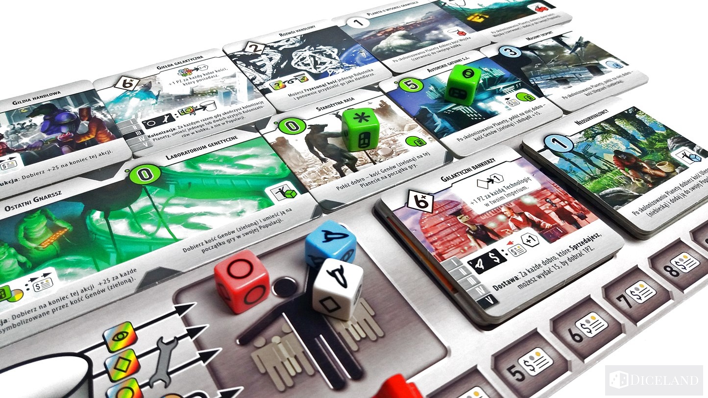Roll for the Galaxy to tytuł, który bardzo przypadł mi do gustu, chociaż klimat sci-fi nie jest mi specjalnie bliski. W grze będziemy zarządzali swoim galaktycznym imperium za pomocą kości. Będziemy robili to za specjalną zasłonką w ukryciu przed innymi graczami. Kości będą odgrywały rolę pracowników, których wyślemy do różnych zadań, takich jak: odkrywanie, rozwój, kolonizacja, produkcja czy też dostawa. Możesz postawić na siłę militarną i podbój innych planet lub produkcję surowców i handel. Najbardziej zaskakującą cechą tej pozycji, jest jej szybkość i dynamika, chociaż samo wytłumaczenie zasad już do najłatwiejszych nie należy. Roll for the Galaxy to tytuł, który bardzo dobrze się skaluje i posiada bardzo duży wskaźnik regrywalności. Dla fanów gier kościanych – pozycja obowiązkowa.